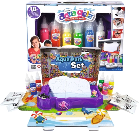 Setul Aqua Park, odată desfăcut, se transformă într-un aquapark colorat cu scenă de joacă. Datorită dozării ușoare din sticluțe și formelor reutilizabile, creația este simplă, curată și captivantă – ideală pentru activități acasă sau ca surpriză cadou.