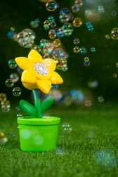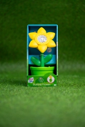 Designul în formă de floare galbenă într-un ghiveci verde atrage imediat privirea și transformă orice joc într-un spectacol vesel plin de buline.