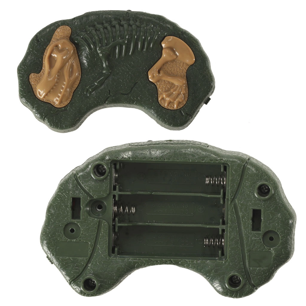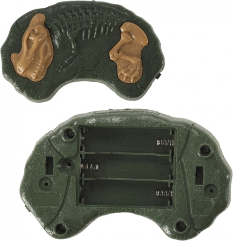 Controller în formă de fosilă cu două butoane: unul pentru mers și mișcarea labelor, celălalt pentru lumini, sunet și mișcările capului.