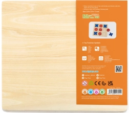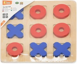 Setul include o tablă de joc din lemn pentru jocul de ţesut şi în total nouă piese din lemn colorate - patru 'X' albastre și cinci 'O' roșii.