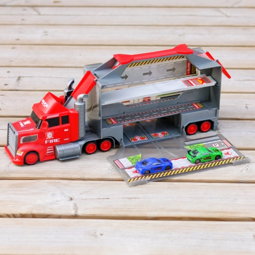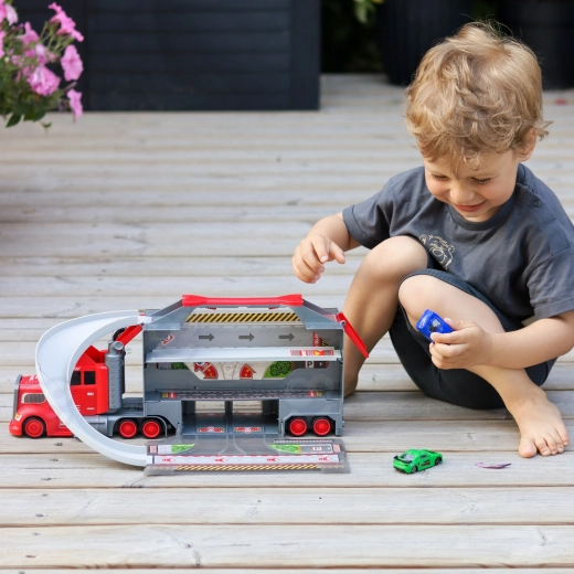 Acest camion multifuncțional, cu un design de pompieri atrăgător, servește ca cap tractor pentru transport, iar după deschidere se transformă într-un set complet de joacă cu garaj, locuri de parcare și pistă dinamică. Datorită lansatorului de mașinuțe, copiii pot începe cursele într-o clipă.