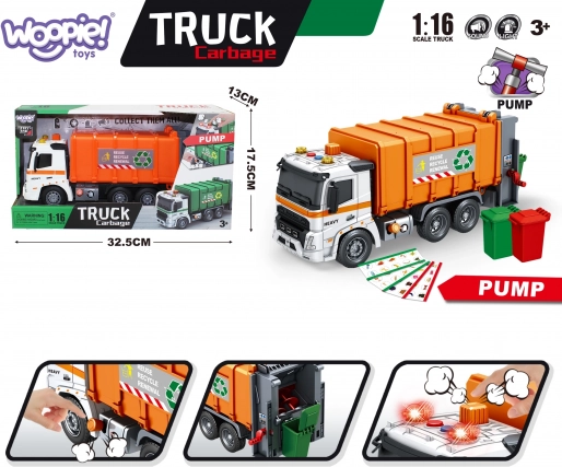Camionul de gunoi Woopie oferă efecte realiste la scară 1:16, care includ diverse efecte sonore și lumini funcționale. Dispune de un sistem pneumatic pentru ridicarea și coborârea containerului și este fabricat din plastic durabil și sigur pentru copii. Trapa din spate a vehiculului este rabatabilă.