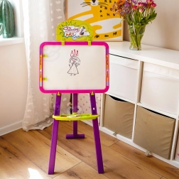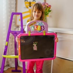 Construcția ușoară și stabilă cu poliță pentru accesorii păstrează totul la îndemână. Tabla este potrivită de la 3 ani și ajută la dezvoltarea creativității, coordonării mână–ochi și colaborării în activități comune. Funcția fluorescentă este alimentată de baterii AAA.
