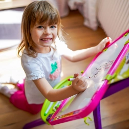 Partea magnetică, whiteboard și suprafața fluorescentă pentru desen cu lumină – copiii aleg exact ce le place și pot alterna tehnicile fără limite.