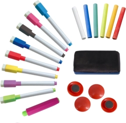 - 8 markere pe bază de apă, 6 bucăți de cretă colorată, 1 burete/șervet, 4 magneți