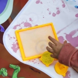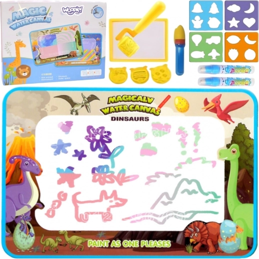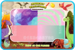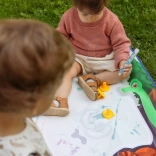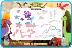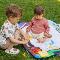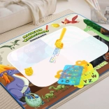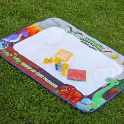 Covorașul mare cu tematică dinozauri transformă podeaua într-un atelier creativ. Desenul se face doar cu apă – fără pete, fără miros și fără griji. De îndată ce apa se usucă, mâzgălelile dispar, iar suprafața este din nou pregătită pentru noi idei.
