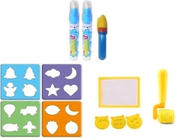 Setul include markere cu apă, ștampile, rolă, șabloane și tăviță pentru apă, pentru ca desenele să fie mai variate, iar învățarea numerelor și literelor mai distractivă.