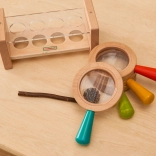 Setul este echipat cu un suport de lemn cu capac transparent, care facilitează depozitarea și protejează lupele. Copiii sunt încurajați în curiozitatea și învățarea lor prin joacă, ceea ce contribuie la dezvoltarea abilităților de observare.