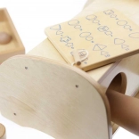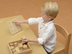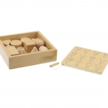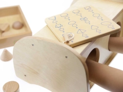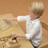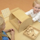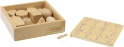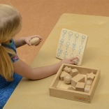 Se recomandă utilizarea setului în combinație cu cutia pentru Ghicește prin Atingere (ME04055). Este disponibilă de asemenea o tavă din lemn pentru depozitarea jucăriilor.