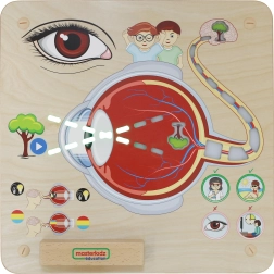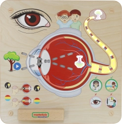 - Când copilul atinge copacul din partea stângă, se aprinde o lumină de la lentilă până la retina ochiului.