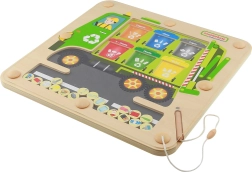 Această tablă unică din lemn de la Masterkidz oferă copiilor o modalitate excelentă de a învăța bazele sortării deșeurilor. Cu ajutorul unui băț magnetic, copiii trebuie să mute discurile cu deșeuri în containerele corespunzătoare. Containerele sunt plasate pe ilustrația unui camion mare de reciclare verde.