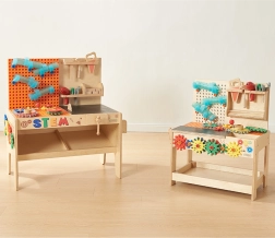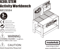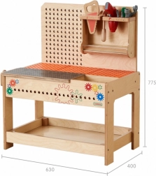 Atelierul din lemn STEM permite distracție creativă și explorarea lumii științei. Copiii pot crea modele frumoase folosind piuneze colorate și geometrice, șuruburi și roți dințate. Înălțimea mesei de 42,5 cm este ideală pentru copiii de la 3 ani.
