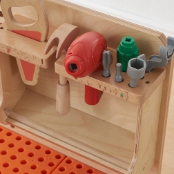 - Conține suport pentru unelte pentru depozitarea setului: unelte de mână - jucărie ciocan, fierăstrău, cheie, triunghi și bloc din lemn pentru exerciții și șurubelniță electronică, mașină de găurit și set de capete.