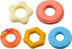 Fiecare inel are o textură diferită, iar unul dintre ele este echipat cu un zornăitor. Astfel, jucăria oferă diverse stimuli auditivi și senzoriali care susțin dezvoltarea percepției și concentrarea. Toate părțile sunt fabricate din materiale sigure, durabile, fără substanțe nocive, fiind adecvate pentru cei mai mici utilizatori.