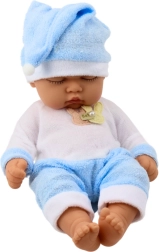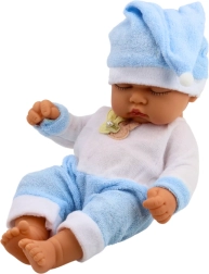 Păpușa are dimensiuni compacte de aproximativ 24 x 12 cm, fiind ideală pentru mâinile copiilor. Pijamalele sunt dintr-un material moale de culoare albastră frumoasă, completate cu o căciuliță adorabilă cu pompon. Un mic imprimeu pe tricou cu motiv de suzetă îi conferă păpușii un farmec delicat, copilăros.
