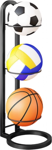 Suport metalic stabil pentru 3 mingi, excelent pentru organizarea și aranjarea echipamentului sportiv.