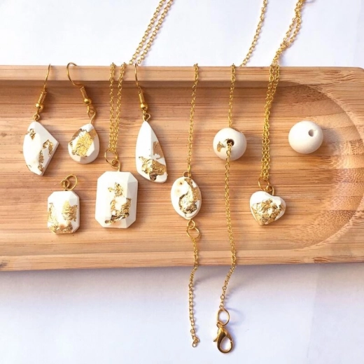 Cum să procedezi? Amestecați cimentul cu apă conform instrucțiunilor, adăugați foițele aurii sau din cupru în formă, turnați compoziția și, după uscare, scoateți piesele turnate. Folosiți instrumentele incluse pentru a finaliza și asambla bijuteriile realizate manual.
