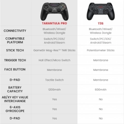 GameSir Tarantula Pro duce jocul la nivelul următor datorită ergonomiei rafinate, comunicării wireless rapide și tehnologiilor avansate. HD Rumble oferă feedback haptic realist, în timp ce giroscopul pe 6 axe și NFC extind capabilitățile pe consolele Nintendo. Eleganta bandă luminoasă RGB și butoanele frontale colorate subliniază stilul său distinct.