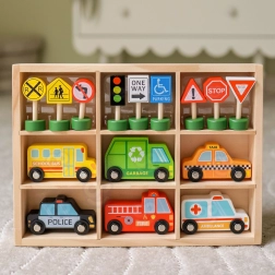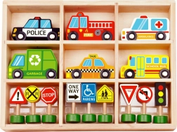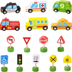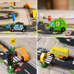 - Conținutul setului: ambulanță, mașină de pompieri, taxi, autobuz școlar, mașină de poliție, mașină de gunoi, semafor și 8 indicatoare rutiere.