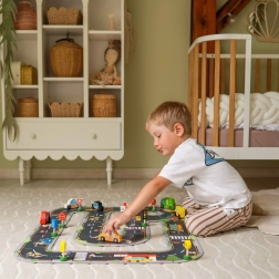 Construirea scenelor, mutarea mașinuțelor și lucrul cu indicatoarele dezvoltă motricitatea fină, creativitatea și abilitățile sociale în jocul de grup.