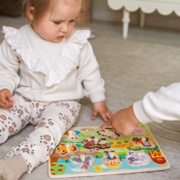 Copiii potrivesc animalele și obiectele în decupajele corecte, învață formele și denumirile și își dezvoltă coordonarea mână–ochi.