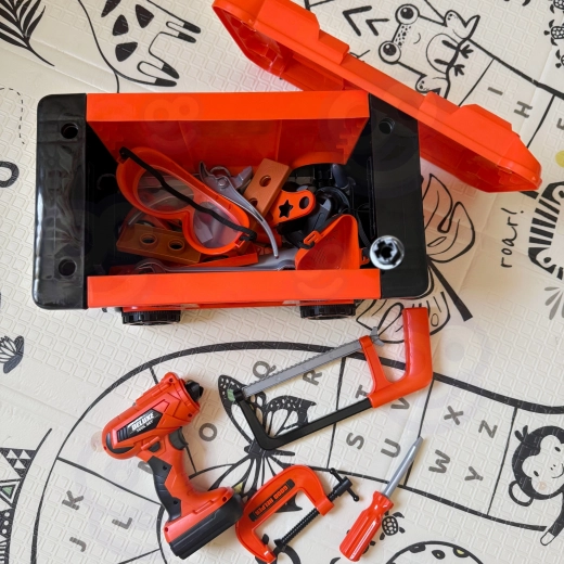 Transformă camera copilului într-un mic atelier cu geanta mobilă de unelte 2în1 de la Woopie. Acest set robust se transformă ușor din atelier de lucru într-o geantă rulantă cu mâner. Conține 65 de piese, inclusiv un instrument multifuncțional realist, pe baterii (2× AA, nu sunt incluse), ochelari de protecție și un set bogat de accesorii pentru jocuri de rol creative, dezvoltarea motricității fine și a abilităților de coordonare.