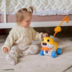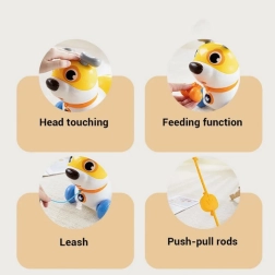 Cățelușul latră și emite sunete realiste, reacționează la atingere și, după „hrănirea” cu osulețul inclus, își arată bucuria. Urechile și coada rotative 360° cresc stimularea senzorială, în timp ce mânerul elastic permite alunecarea lină pe podea fără agățări – acasă și pe covor.