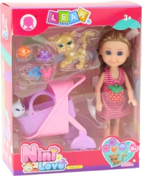 Mini păpușa din set are părul lung blond împletit în codițe, îmbrăcată într-o rochie cu dungi roz și pantofi roz. Setul include un cărucior roz-mov destinat transportului a două pisicuțe drăguțe – una albă și alta maro. Setul este completat cu accesorii pentru animale, precum o pălărie, căciulă și două coroane, ceea ce permite copilului să creeze diverse scenarii și să își dezvolte imaginația.