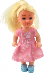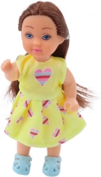 - Păpușă cu părul șaten în rochie galbenă cu inimioare