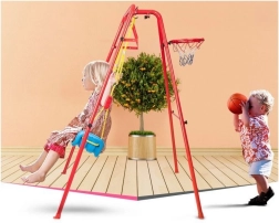 Include un coș de baschet ce se poate fixa pe cadru, adăugând distracția aruncărilor la coș. Ideal pentru activități în aer liber și dezvoltarea motricității.