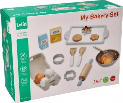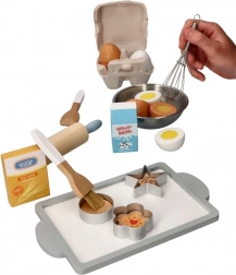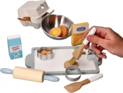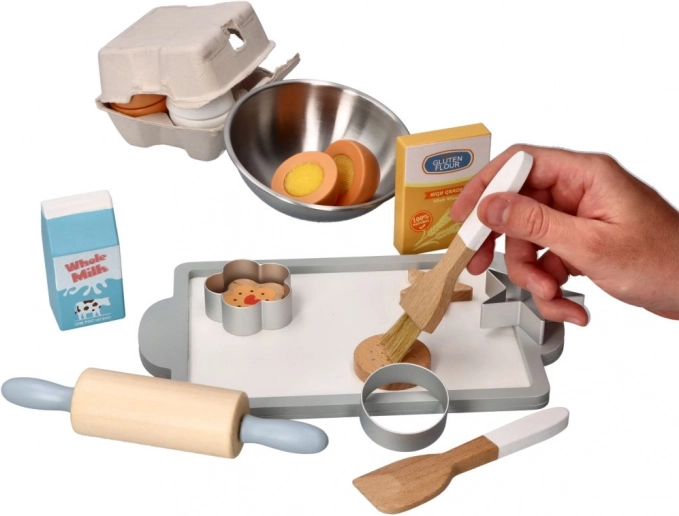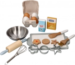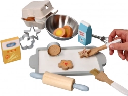 Acest set bogat echipat pentru jocul de-a brutarul oferă copiilor o experiență autentică în bucătărie. Datorită lemnului și oțelului inoxidabil rezistente, piesele sunt sigure, plăcute la atingere și ușor de întreținut. Copiii pot încerca amestecarea, întinderea aluatului, decuparea și decorarea „biscuiților” – exact ca adulții.