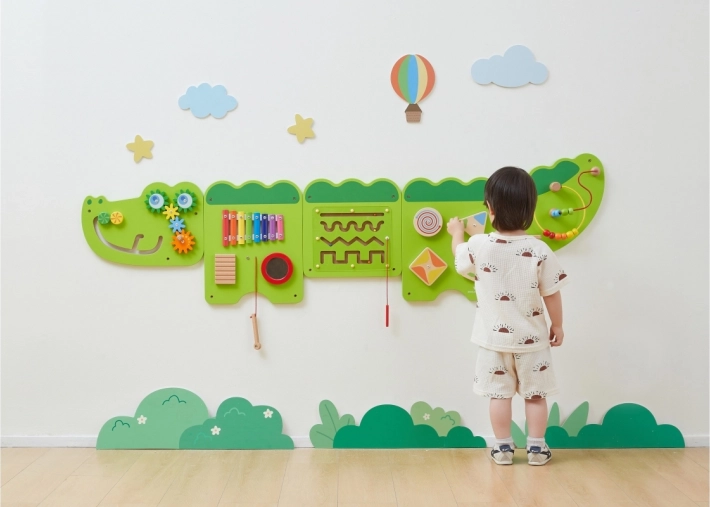 Această tablă activă de perete din lemn, în forma unui crocodil, oferă copiilor de la 18 luni ore întregi de explorare senzorială și antrenament al motricității fine. Include xilofon, roți dințate, labirint, elemente glisante și rotative, precum și mărgele pe sârmă, care dezvoltă coordonarea mână–ochi, gândirea logică și percepția muzicală. Montajul pe perete economisește spațiu și este ideal pentru camerele copiilor, grădinițe și colțuri de joacă.