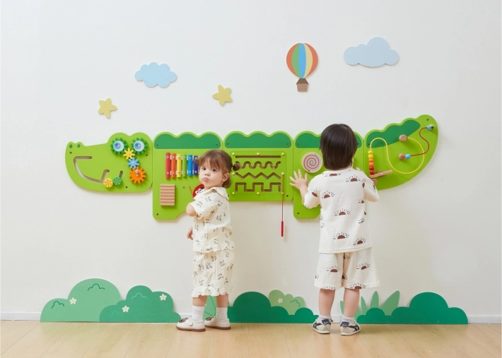 Fiecare panou oferă un alt tip de activitate – de la cântat la xilofon, la rotirea roților dințate și a discurilor cu modele, până la ghidarea mărgelelor și deplasarea pieselor în labirinturi. Copiii își exersează în mod natural coordonarea, priza, răbdarea și rezolvarea de probleme. Montajul pe perete economisește spațiu și permite jocul simultan al mai multor copii.