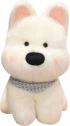 Căţeluşul de pluş se remarcă prin blana sa albă și fină și ochii negri, care îi conferă un aspect deosebit de drăguț. Designul general este îmbogățit de o eşarfă decorativă în nuanțe de albastru care subliniază caracterul său prietenos.