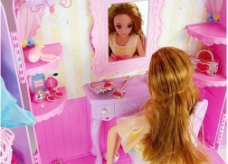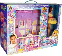 Pachetul conține: păpușă, casă, 2 perechi de pantofi cu toc, geantă, diademă, colier, 3 umerașe, cercei, stativ pentru haine, scaun, 3 seturi de haine, stickere, produse cosmetice, uscător de păr, parfum, lac de unghii, oglindă, reflector iluminat și multe altele.