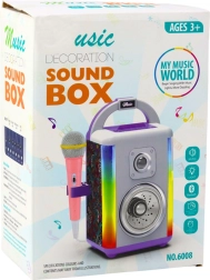 Setul de muzică este echipat cu un microfon, un design ușor de transportat și intrări pentru căști și MP3. Pe panou puteți schimba regimurile, efectele și volumul. Modul Bluetooth permite redarea melodiilor preferate de pe telefon sau player MP3. Datorită dimensiunilor compacte și efectelor sonore și vizuale intense, setul este perfect pentru utilizare acasă și petreceri pentru copii.