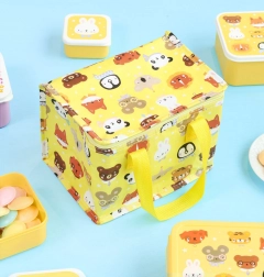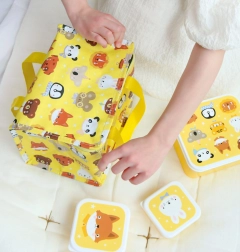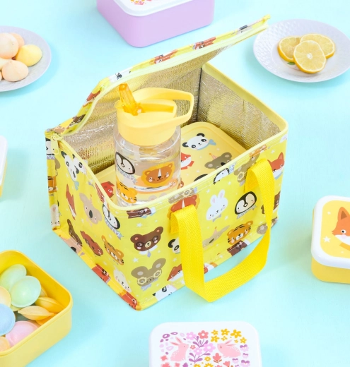 Această geantă frigorifică galbenă nu doar că se remarcă prin designul său frumos cu prieteni animali, dar și prin caracterul său practic. Este fabricată din 90% plastic reciclat, contribuind astfel la protecția mediului.
