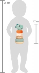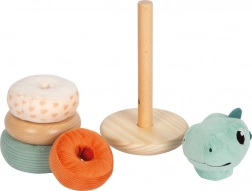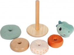 Această jucărie motrică în formă de turn legănător cu patru inele colorate este ideală pentru recunoașterea dimensiunilor și culorilor. Turnul conține un băț central mobil sigur și un cap zâmbitor de dinozaur. Baza rotunjită asigură stabilitate, în timp ce inelele din material textil și lemn variate atrag prin designul lor.