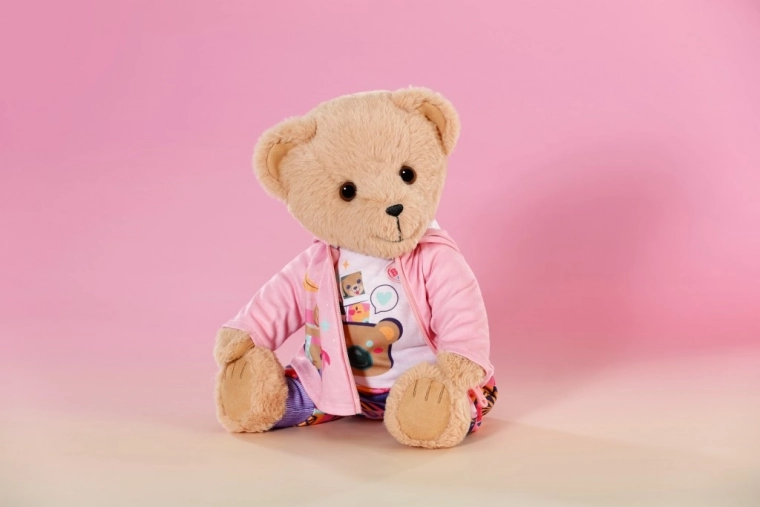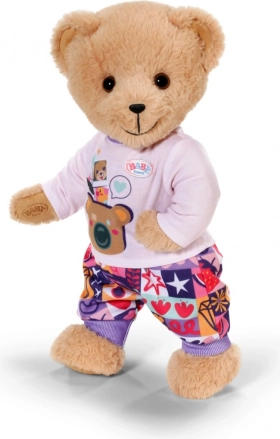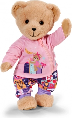 Cu acest set de haine, oferi păpușii și ursulețului BABY born Teddy confort și stil pentru orice aventură. Hanoracul roz cu fermoar, glugă și urechiușe drăgălașe se îmbracă ușor, tricoul liliachiu deschis cu mânecă lungă și ursuleț este foarte moale, iar pantalonii cu model patchwork colorat garantează confort la joacă.