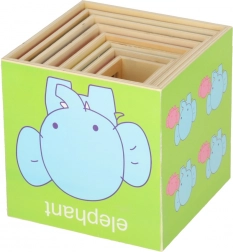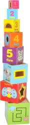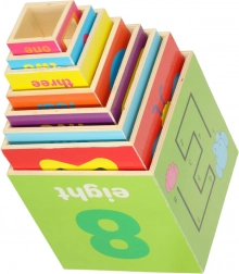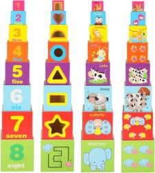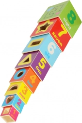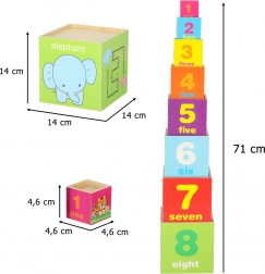 Acest set conține 8 cuburi colorate din lemn, care pot fi așezate unul peste altul pentru a crea un turn înalt de până la 71 cm! Fiecare cub are 8 fețe educaționale active, oferind diverse oportunități de joc și învățare.