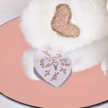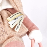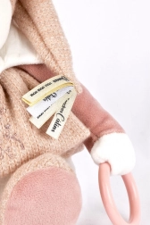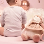 Ursulețul de pluș polar are o căciuliță roz delicată decorată cu panglici satinate cu mesaje tandre în franceză. Trupul este fabricat dintr-un material catifelat cu o broderie delicată a mărcii Doudou. Ursulețul oferă diverse stimuli pentru dezvoltarea simțurilor și a motricității fine: