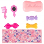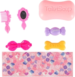 • Accesorii: jucărie săpun, pieptene, oglindă, fundiță-clips, bomboană, biscuiți
