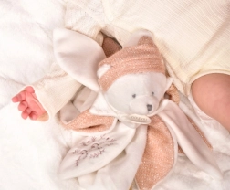 Acest ursuleț din pluș este realizat dintr-o țesătură fină roz și este decorat cu o broderie delicată. Petale mari pe corpul ursulețului ajută la dezvoltarea abilităților motorii fine ale copilului și oferă totodată o senzație de confort și siguranță.