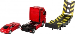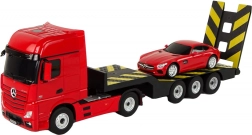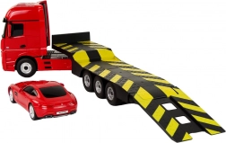Vehiculul are dimensiuni de 64 cm x 16 cm x 10 cm, permițând transportul altor jucării. Mașinuța roșie Mercedes, parte a setului, este complet controlabilă prin telecomandă și are dimensiuni de 18 cm x 5 cm x 8 cm, ideală pentru mâini de copii. Toate piesele, inclusiv telecomanda cu dimensiuni de 13 cm x 6 cm x 10 cm, sunt realizate din plastic durabil, asigurând distracție de lungă durată.