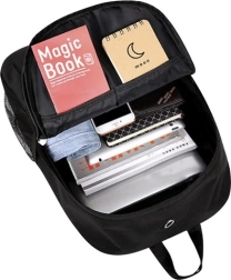 Rucsacul negru elegant, din țesătură Oxford rezistentă, este impermeabil și, datorită spatelui și bretelelor căptușite cu plasă MESH, se poartă confortabil pe tot parcursul zilei. Imprimeul reflectorizant luminos îți sporește vizibilitatea la amurg și pe întuneric, fiind excelent pentru școlari, în oraș și în excursii.