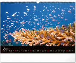 Pagina din martie a calendarului vă inundă cu energie datorită unei scene pline de pești mici printre recifele de corali. Fundalul albastru oceanic adaugă dinamism și prospețime imaginii.