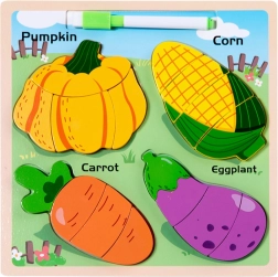 Această puzzle din lemn oferă copiilor o oportunitate excelentă de a învăța formele și de a exersa motricitatea fină. Conține patru tipuri populare de legume: dovleac, porumb, morcov și vânătă. Fiecare element este împărțit în părți mai mici, pe care copiii le asamblează în zonele corespunzătoare ale suprafeței.