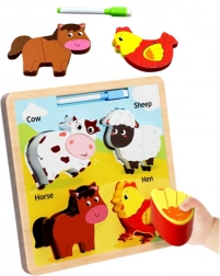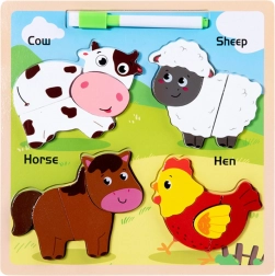Acest puzzle educațional din lemn conține animale precum vaca, oaia, calul și găina, care sunt cunoscute copiilor. Fiecare animal este format din mai multe părți, care trebuie potrivite în locul potrivit, ceea ce susține coordonarea mișcărilor și gândirea logică.