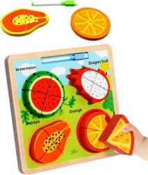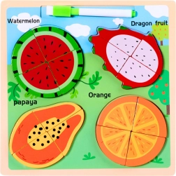 Puzzle educațional din lemn cu motive fructate este jucăria perfectă pentru dezvoltarea coordonării și a gândirii logice a copiilor. Conține patru piese frumoase de fructe: pepene, pitaya, papaya și portocală. Fiecare piesă este împărțită în mai multe părți care trebuie asamblate, oferind o provocare și distracție.