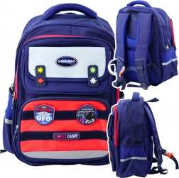 Acest rucsac școlar are un compartiment principal spațios cu un despărțitor interior pentru organizarea ușoară a cărților și caietelor. Copiii au la dispoziție un al doilea compartiment mai mic, un buzunar frontal și un mic buzunar cu clapă velcro. Partea frontală a rucsacului include benzi velcro la care se pot atașa elemente decorative pentru un caracter individual al rucsacului. Setul include petice cu motive cosmice, precum planete și rachete.